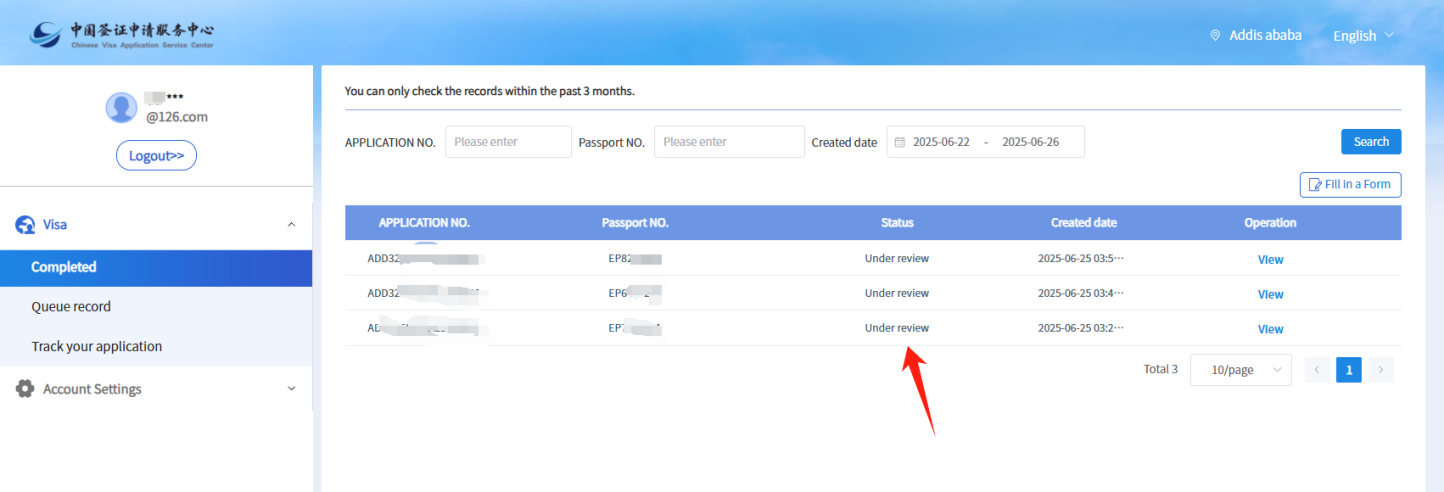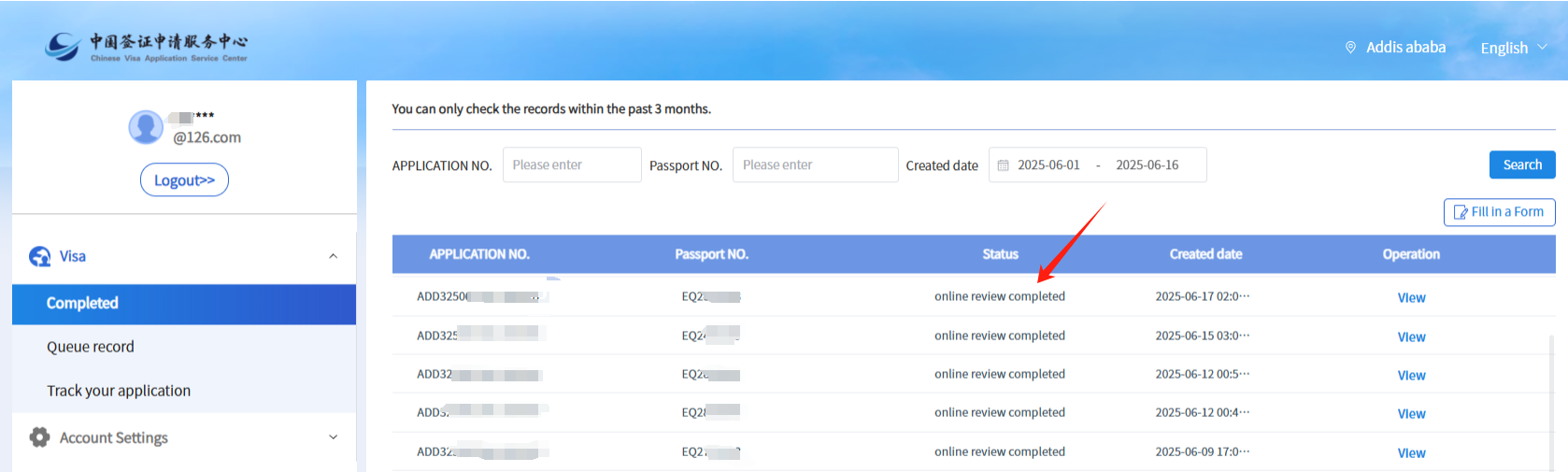 (2) You may receive an email confirming that your application has passed the review. Your status will then be: "Online review completed". Please print the email attachment "Visa Application Receipt" and bring it along with the other required materials (see Step 2) to the visa center.