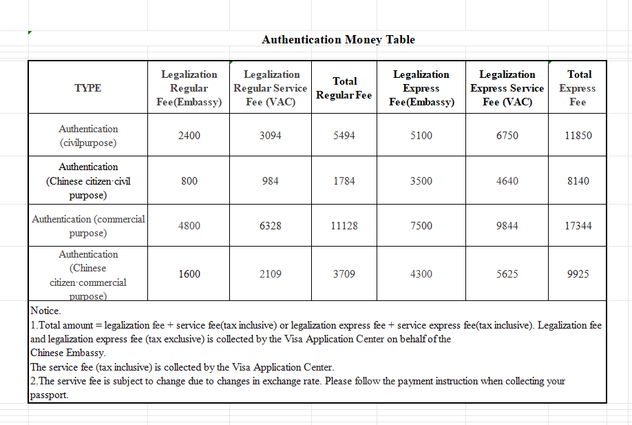 (1) The consular legalization fee will be charged by the Visa Application Center on behalf of the Chinese Embassy on the date of application in Bangladesh Taka. The actual amount to be paid is subject to the Chinese Embassy 's approval.