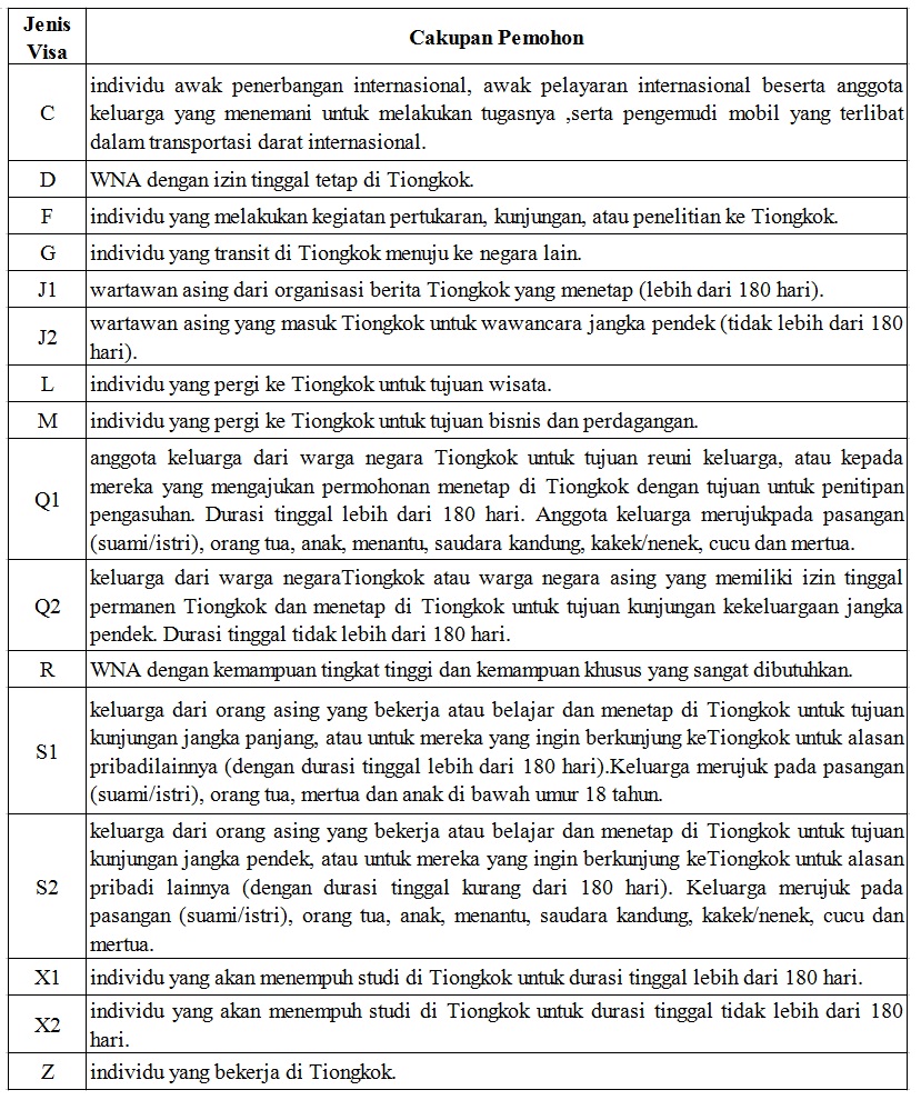 Untuk lebih memfasilitasi pengajuan visa Tiongkok, pengambilan sidik jari akan dibebaskan bagi semua pelamar visa jangka pendek (tinggal tidak lebih dari 180 hari) di Kedutaan Besar Tiongkok dan Konsulat Jenderal di Indonesia mulai saat ini hingga tanggal 31 Desember 2026. Namun, pengambilan sidik jari tetap diperlukan, sesuai dengan peraturan terkait, bagi pelamar visa D, J1, Q1, S1, X1, dan Z yang perlu mengajukan izin tinggal setelah memasuki Tiongkok (untuk detailnya, silakan periksa tabel berikut).