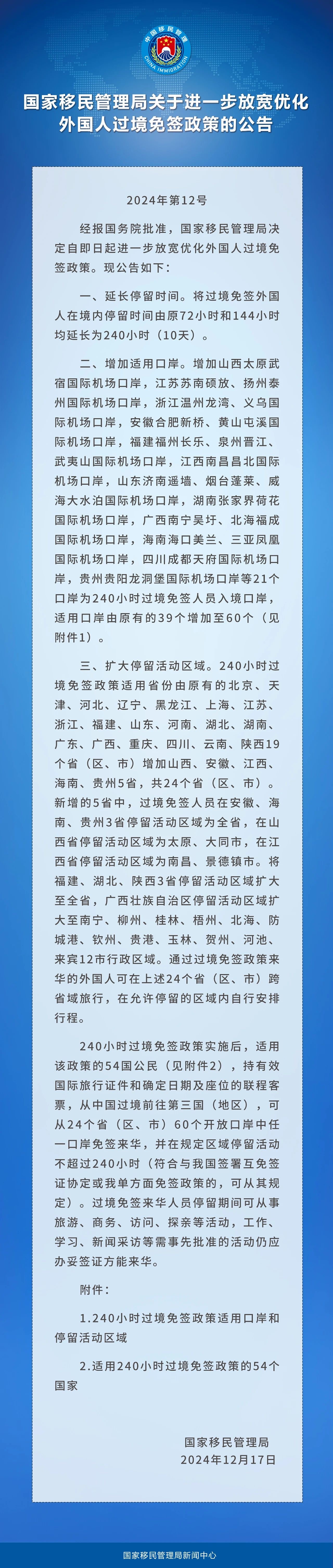 240小时过境免签政策
