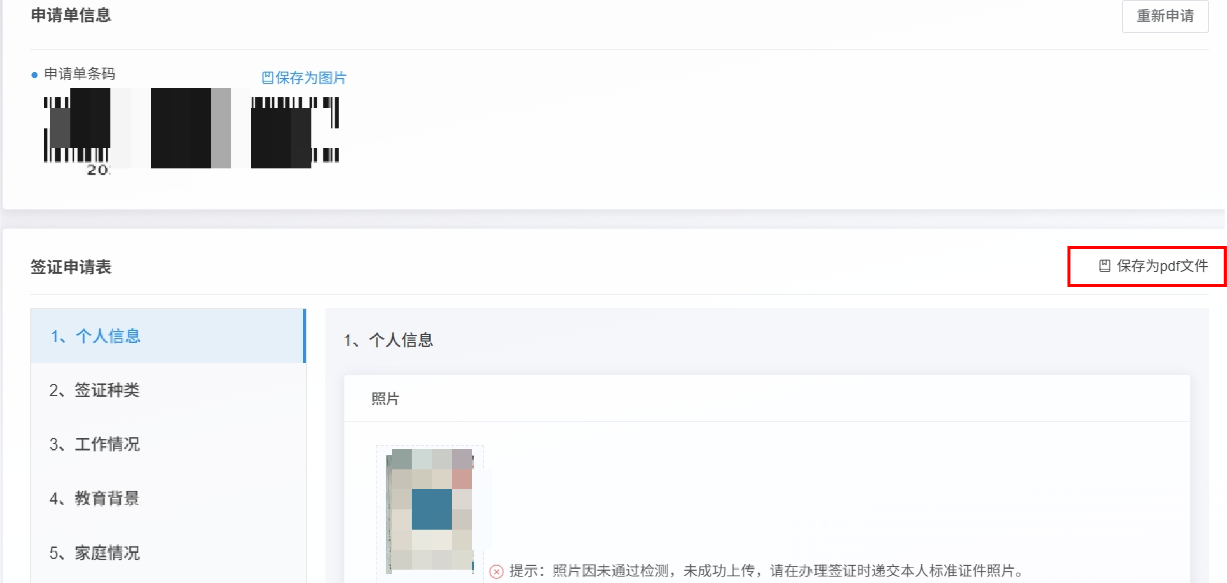 6. 点击“详情”,展开申请信息页面,点击“另存为PDF文件”,即可下载已填写的申请表。