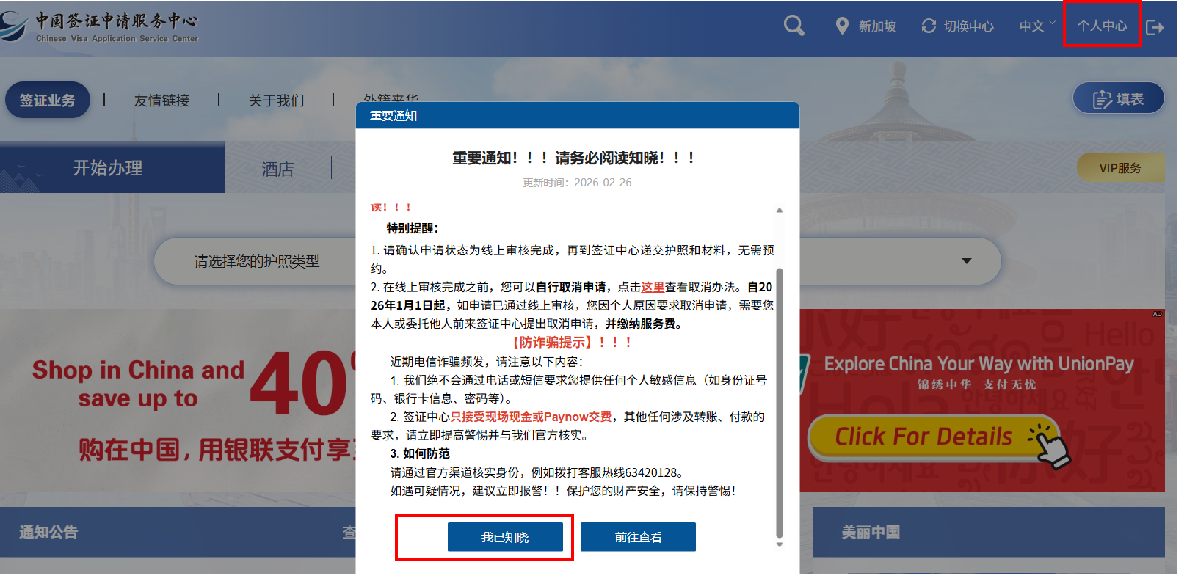 4. 仔细阅读弹窗内容后,点击“我已知晓”,然后再点击右上角的“个人中心”。