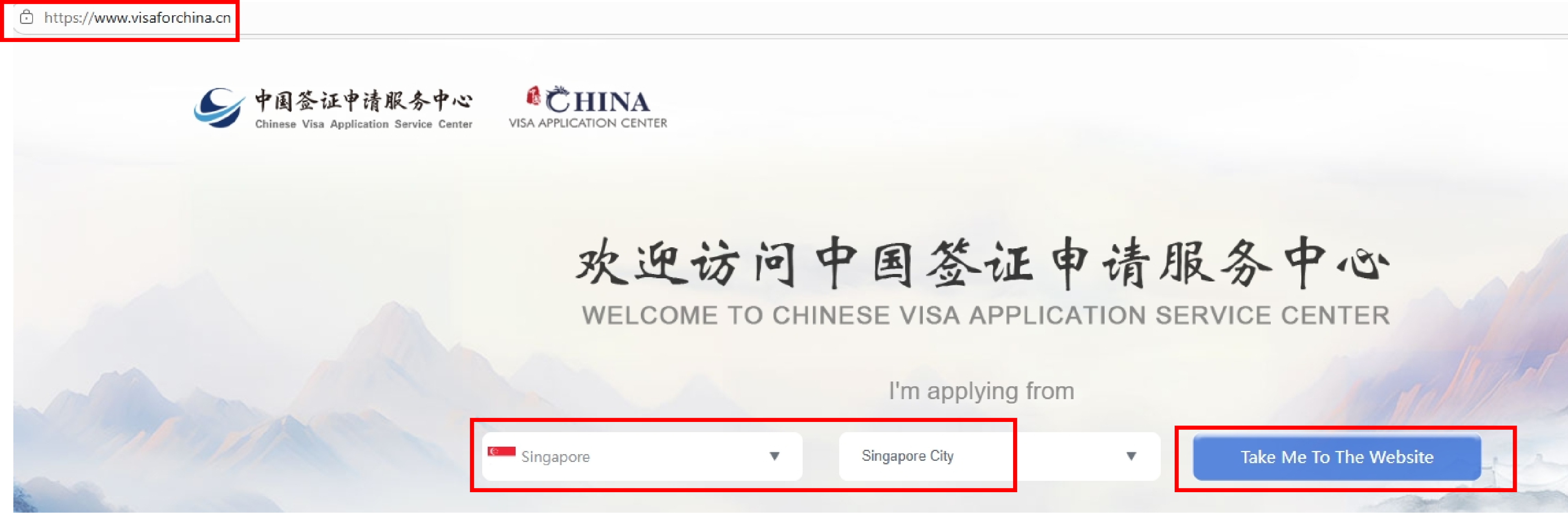 1.输入中心网址www.visaforchina.cn,选择“新加坡”,点击“Take me to the website”。